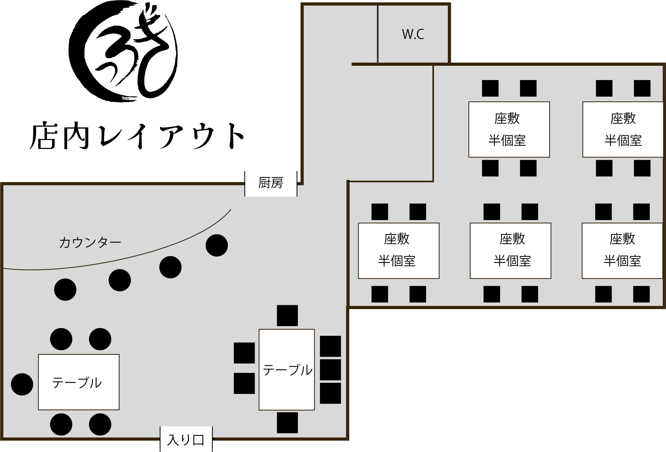 カウンターから座敷まで、おひとり様からカップル、ご家族、お仲間、忘年会や新年会など様々なお客様にごくつろぎいただける空間をご提供いたします。